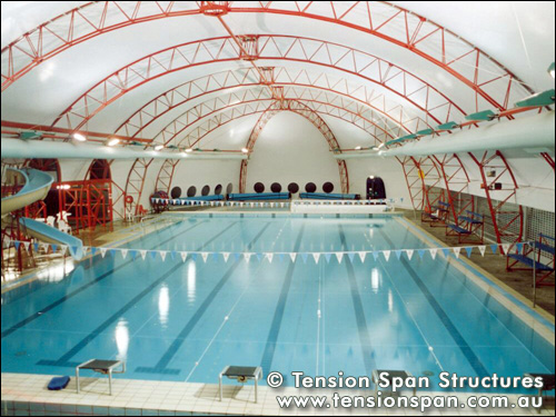 North Sydney Olympic Pool installed a new air inflated removable enclosure in May 1987. The curved red and white membrane provides winter protection for the 50 metre Olympic Pool, Toddlers Pool and is removable for the summer.