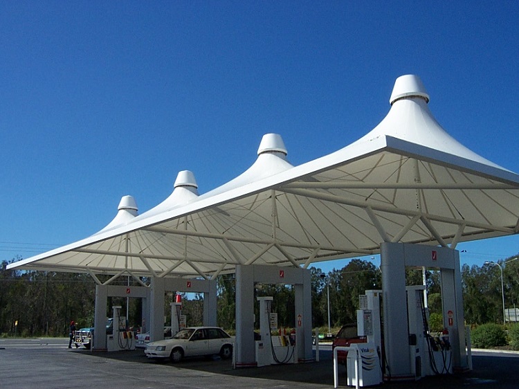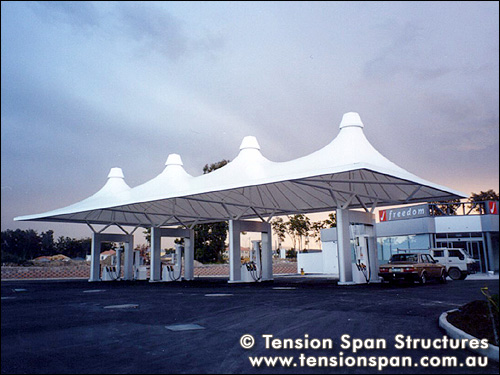 Located adjacent to a major growth corridor to the Gold Coast, this fuel station canopy has proven a major attraction for motorists. The four linked conical membrane provides high quality shade over eight filling bays with spectacular lighting effects at night.