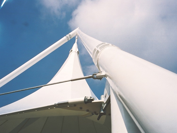 The 'A' frame uses a well placed 'kink' in the plane to minimize bending at the attachment points. All steel is hot dip galvanised (pins) and polyurethane coated. Fittings and fasteners are either galvanised (pins) or stainless steel. The apex cone is vented and the frame splices detailed to fit within the tube diameters to give a neat appearance. Stainless steel fittings are used on all guy cables. The fabric used for this structure is made from durable PVC fabric.