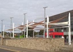 Tension Span Structures Pty Ltd: Custom Hypars in Ireland Downer International completed a custom Tension Span design using Multiple Hypars over a Playground Pavilion. The final result added a stunning visual feature as well as shelter from the elements outside the well-known Tesco chain in Roscrea, Ireland. |